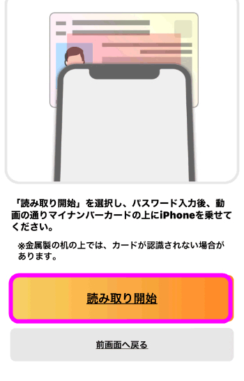 ここでもう一度マイナンバーカードが必要になってきます。「読み取り開始」をタップ。