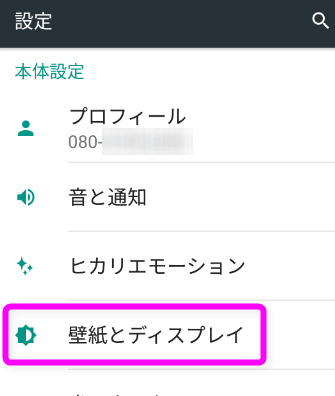 AQUOS PHONEの場合は、「設定」を開き、「壁紙とディスプレイ」を開きます。