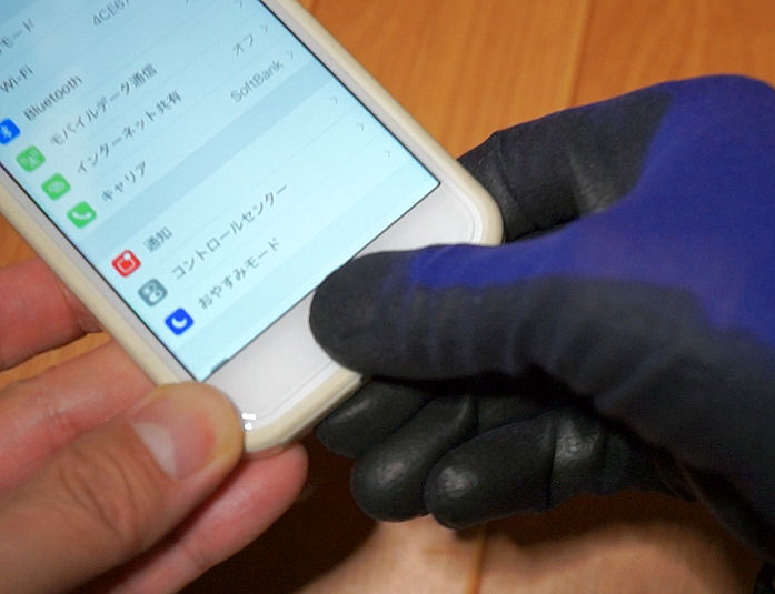 まずは肉体労働時に使用する薄手のすべり止め作業手袋で操作してみました。と、iPhoneでもアンドロイドでもどちらでも操作ができました。