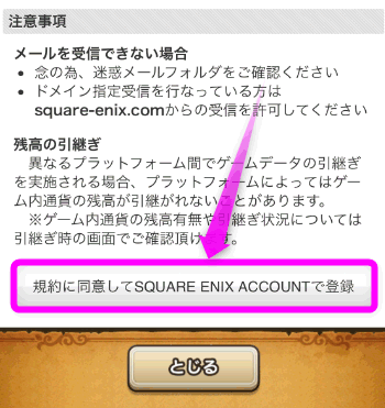「規約に同意してSQUARE ENIX ACCOUNTで登録」をタップします。