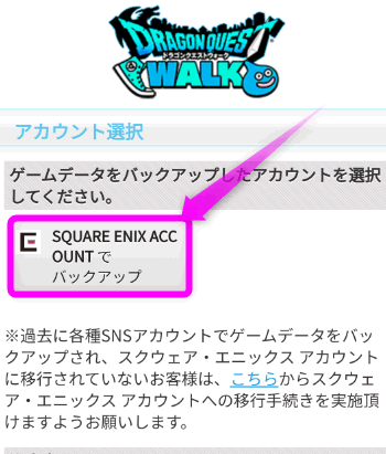 「アカウント選択」の画面にある「SQUARE ENIX ACCOUNTでバックアップ」をタップします。