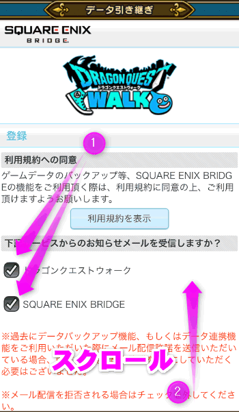 利用規約が表示されるので、①「ドラゴンクエストウォーク」と「SQUARE ENIX BRIDGE」からのお知らせメールが必要ない人はチェックを外しておいてください。