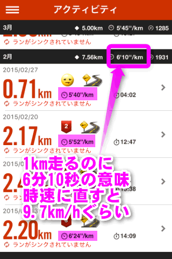 ジョギングやマラソンの場合、「時速」というよりは「ペース」を用いることが多く、これは1キロ走るのにどれくらいかかったか、を表しています。