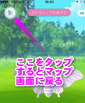 もし、ポケモンの画面を開いてしまったら、左上の走り去るアイコンをタップすると、マップに戻れます。