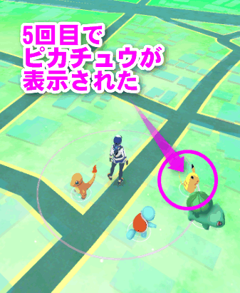 400mほど歩き続けると、マップ上にピカチュウが表示されました。