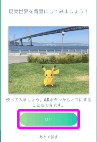 カメラへのアクセスなどの許可をOKにすると、このように「近くにポケモンがいるぞ!」と表示されます。