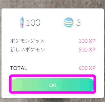 ゲットしたポケモンのプロフィールを確認したら、チェックマークをタップします。