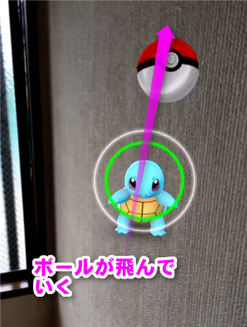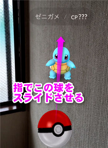 ポケモンが画面に表示されるので、下にあるモンスターボールをタップし、タップしたまま上に指をスライドさせます。