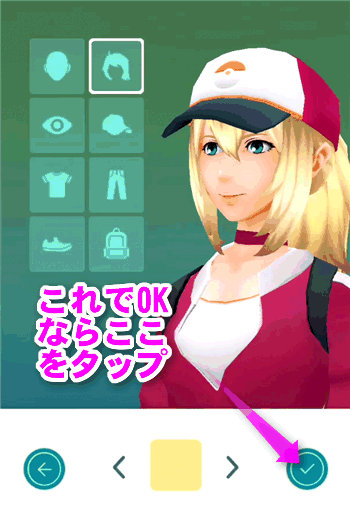 その後、「肌の色」「髪の色」「瞳の色」「帽子のデザイン」「シャツのデザイン」「ズボンのデザイン」「靴の色」「鞄の色」を選択し、すべて決めたら右下のチェックマークをタップして決定します。