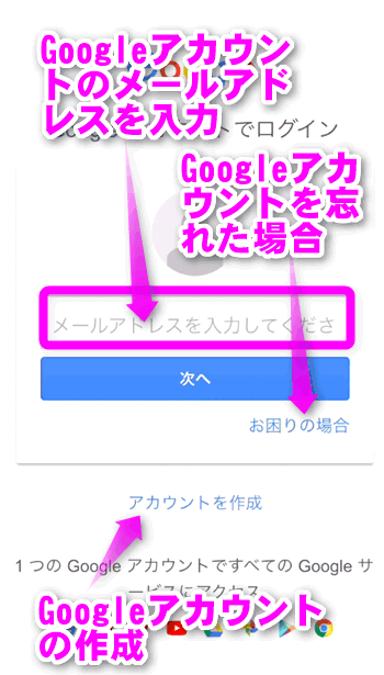 ここから新しくGoogleアカウントを取得することもできます。