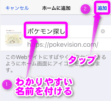 この「Poke Vision」のページをホーム画面に配置しておくと、すぐに調べることができます。やり方は以下。