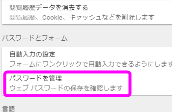「パスワードとフォーム」という部分に「パスワードを管理」があるのでここをクリックします。
