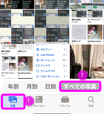「写真」アプリを開いたら、①「写真」タブをタップし、②「すべての写真」をタップします。