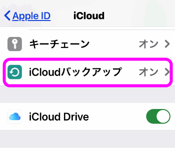 この状態でバックアップします。1つ戻って「iCloudバックアップ」をタップします。