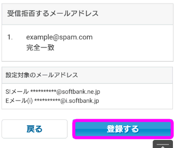 特定のメールを拒否したい場合は、「拒否するメールの登録」の「登録する」をタップします。