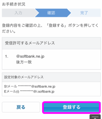 「許可するメールの登録」までスクロールし、「登録する」をタップします。