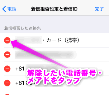 着信拒否を解除したい電話番号・メールアドレスの左側の赤い丸(マイナス)をタップします。