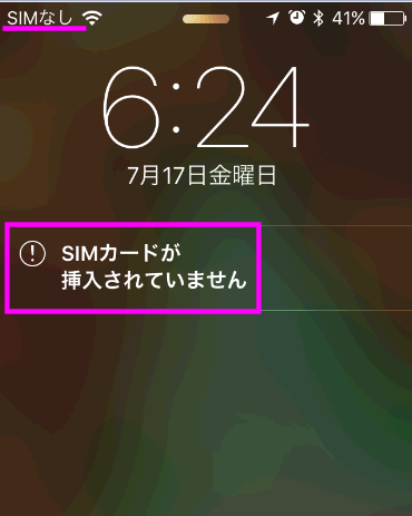 SIMカードを抜くと、ディスプレイに「SIMカードが挿入されていません」と表示されました。