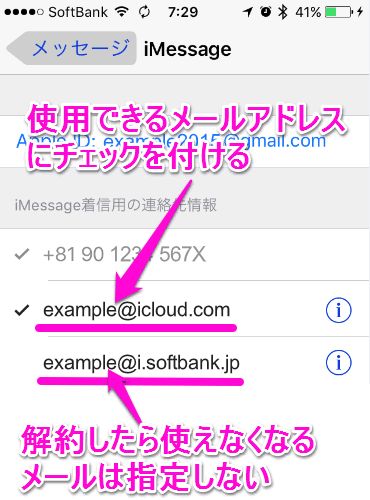 iMessageのアドレスを使用できるiCloud取得時に与えられたメールアドレス( @icloud.comや @me.com )やGmailやYahoo!メールなどを指定すれば再び使えるようになります。