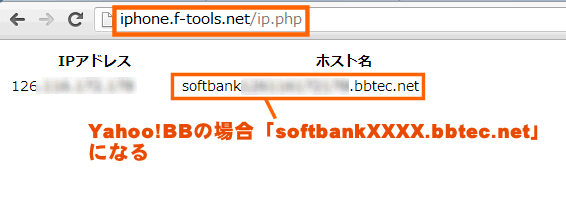 なお、Yahoo!BBだとホスト名は、softbank0000.bbtec.netとなるようです。