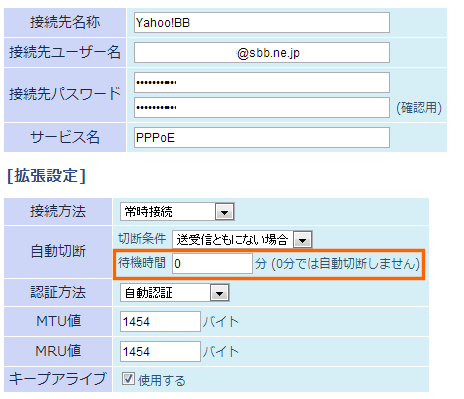 もし、インターネットにずっと接続させておきたい場合は、「自動切断」の「待機時間」を0にしておきます。