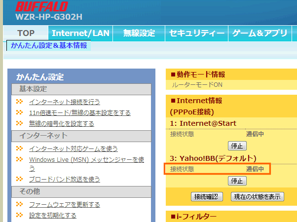 ルーターの設定画面のトップに戻り、このように「通信中」と表示されていれば接続が完了しました。
