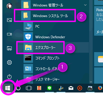 エクスプローラーは、①スタートボタンをクリックし、スタートメニューの②「Windows システムツール」の中にある③「エクスプローラー」をクリックすると開くことが出来ます。