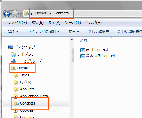 なお、パソコン上の「アドレス帳」は、Cドライブの「ユーザー」の中のパソコンのアカウント用のフォルダに入っています。(画像参照)