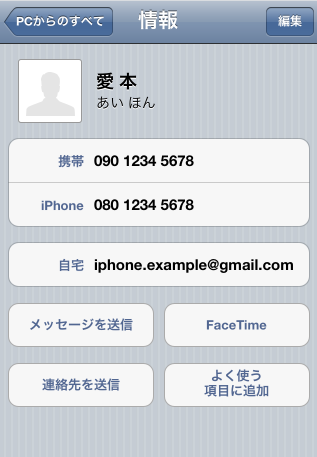 なお、パソコンやGmailの連絡先のデータは、iPhoneにすでに保存してあるデータ(iPhoneで作成したり、古い携帯から取り込んだデータ)とは、別のところに保存されるので、「置き換える」を選択したからといってiPhoneのデータが置き変わってしまうわけではないので注意してください。