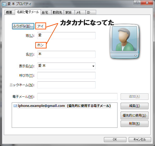 iPhoneで作成したデーター「愛 本」は、ふりがなをひらがなで入力したはずなのですが、パソコンのアドレス帳に作成されたデータは、なんとカタカナ。
