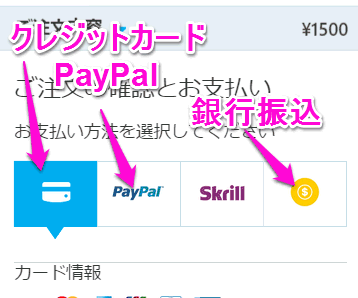 クレジットカードやPayPal、銀行振込の場合、1,500円からになります。