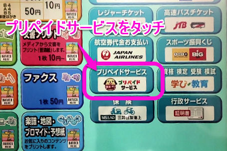 セブンイレブンのコピー機の画面に表示されている「プリペイドサービス」をタッチします。