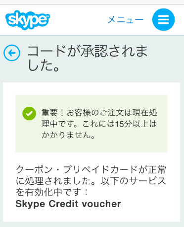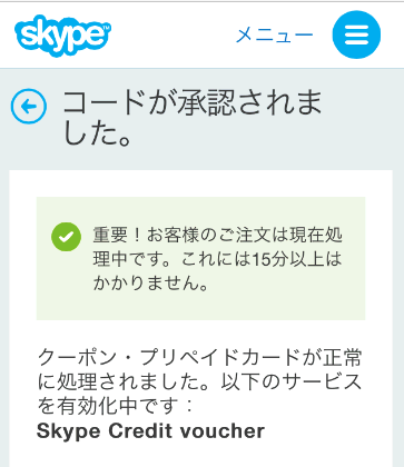 Skypeクレジットを確認してみると、金額が追加されていました。