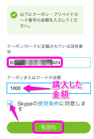 チケットの番号を入力し、「Skypeの使用条件に同意します」にチェックを入れたら、「有効化」をタップ。