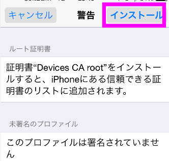 このプロファイルは署名されていません。という警告が出ますが、そのまま「インストール」をタップしてください。