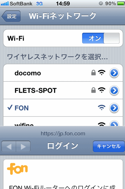 「FON」をタップすると・・・、右のようにログインでき、ログイン後使用出来るようになります。