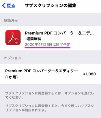 先ほどと違い「サブスクリプションをキャンセルする」の項目がなくなり、「〇〇日に終了予定」という表示になりました。
