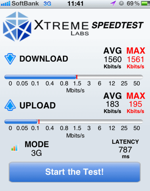 以前(2011年4月)に、ソフトバンクの3G回線を使ったときに測定したときは(GIZMODEさんと同じサイトで測定)、左の画像のように最大2Mbps。平均速度も1.64Mbpsの速度が出ていました。