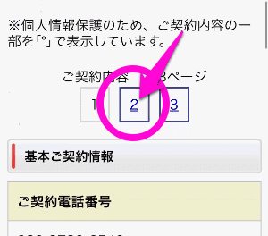 1ページ目は、電話番号や住所、支払い方法などが記載されているので、「2」をタップして2ページめへ進みます。