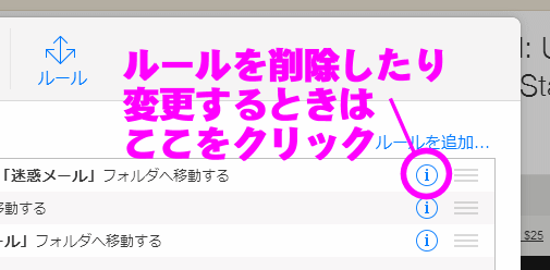 保存したルールを削除したり、修正するときは、ルールの一覧の i のマークをクリックします。