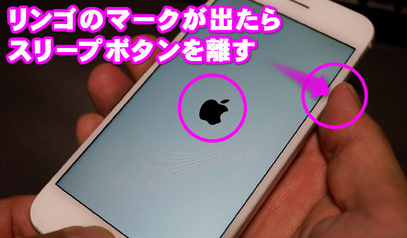 ホームボタンとスリープボタンを同時に押し、リンゴのマークが出たらスリープボタンを離します。