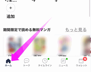 iPhoneのLINEを開いたら、左下の「ホーム」をタップします。