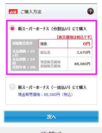 2年契約をする代わりに、端末代を割り引く「月月割」を適用するには、「新スーパーボーナス」にチェックを入れます。