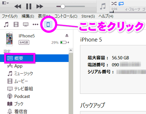 iPhoneの概要やバックアップ、同期などを実行するには、このアイコンをクリックします。