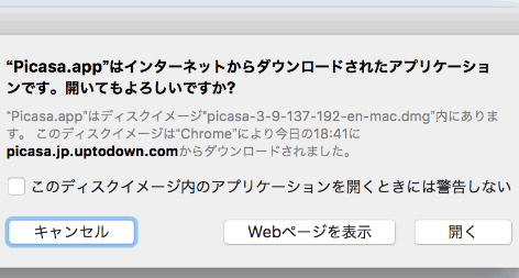 この「Picasa.app」をダブルクリックすると、Picasaというアプリが起動するのですが、このままだと先程の警告が表示されてしまいます。