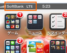 LTE圏内だとこのように「SoftBank LTE」と表示され3Gと同じアンテナ数で表示されます。