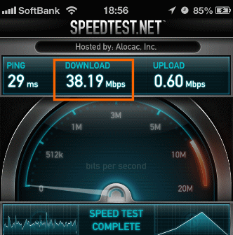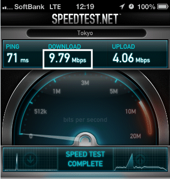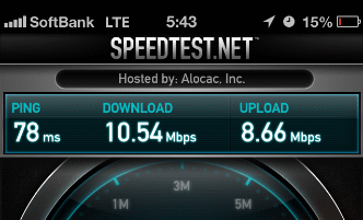 以前、iPhone4で計測した時(auとSoftBank iPhoneの回線速度比較)では1~1.5Mbpsでしたが、6~9倍ほどの速度です。