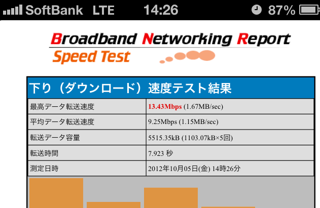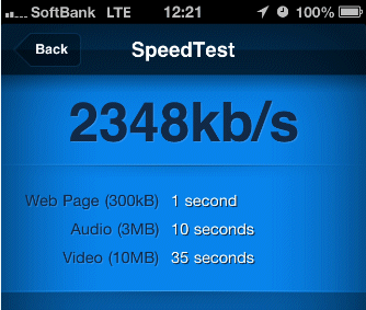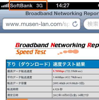 3Gは7.4Mbpsですが、iPhone4の頃は1Mbpsぐらいだったので、iPhone5では3G回線も数倍速くなったことがわかります。