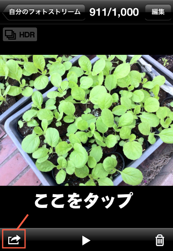 フォトストリームに収められている写真の1つをタップしてみると、左下に矢印のボタンが。