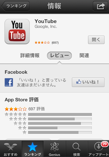 レビュータブをタップすると、評価が表示されます。